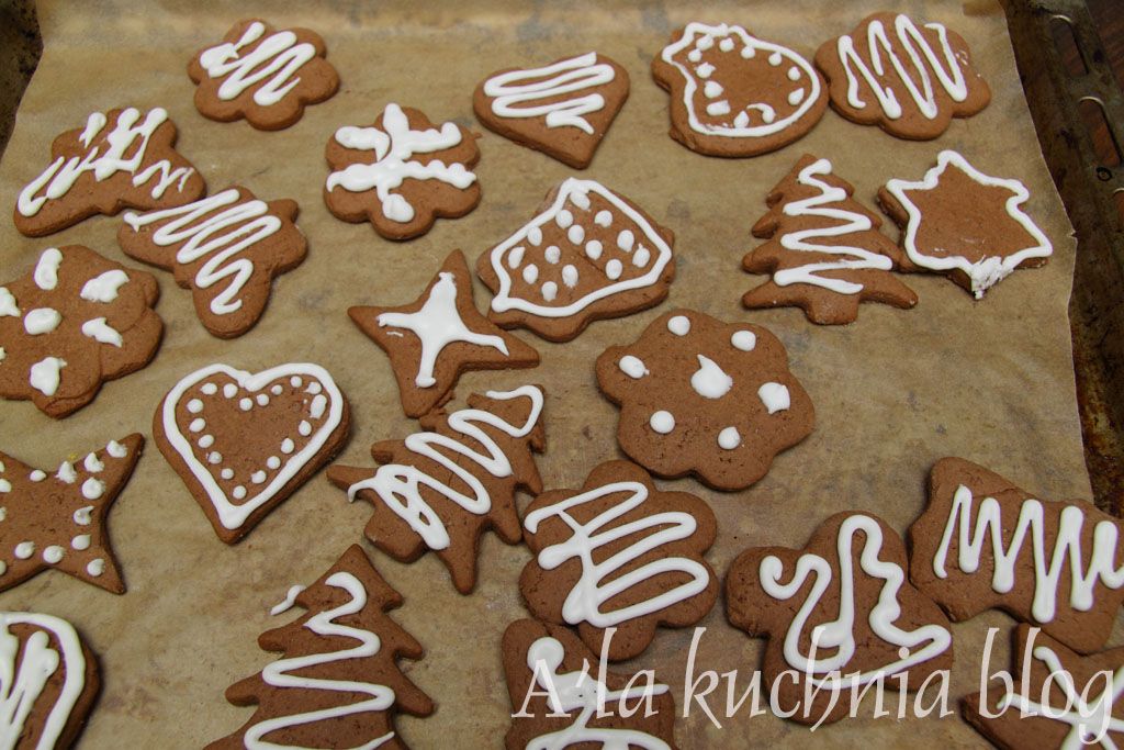 Białko miksujemy dodając partiami cukier puder tak długo, aż otrzymamy błyszczącą i bardzo gęstą masę. Przekładamy ją do woreczka lub rękawa cukierniczego i ozdabiamy pierniczki. Zostawiamy do zastygnięcia lukru i dopiero wtedy przekładamy do pojemniczków – u nas zniknęły w ciągu 2 dni.