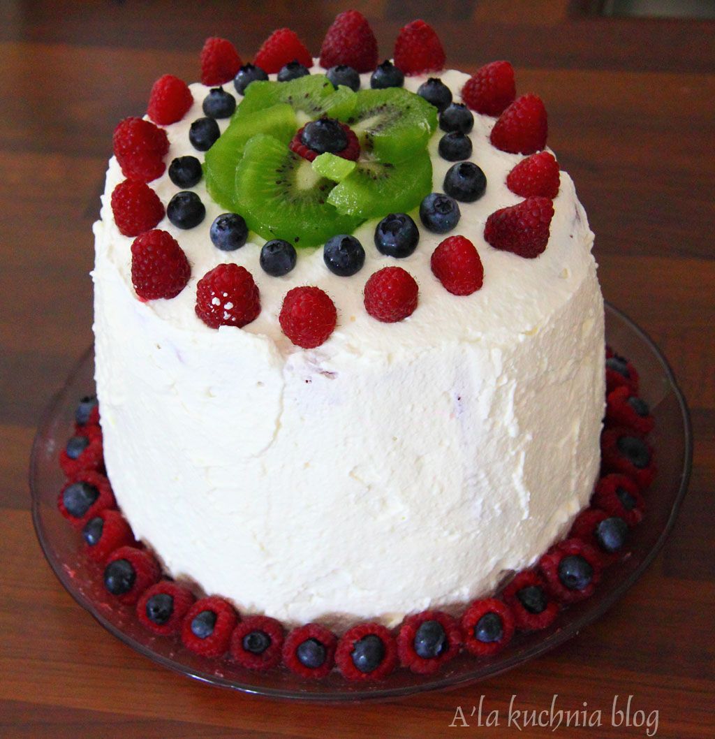 Tort po wyjęciu z lodówki obkładamy równomiernie bitą śmietaną i dekorujemy owocami.
