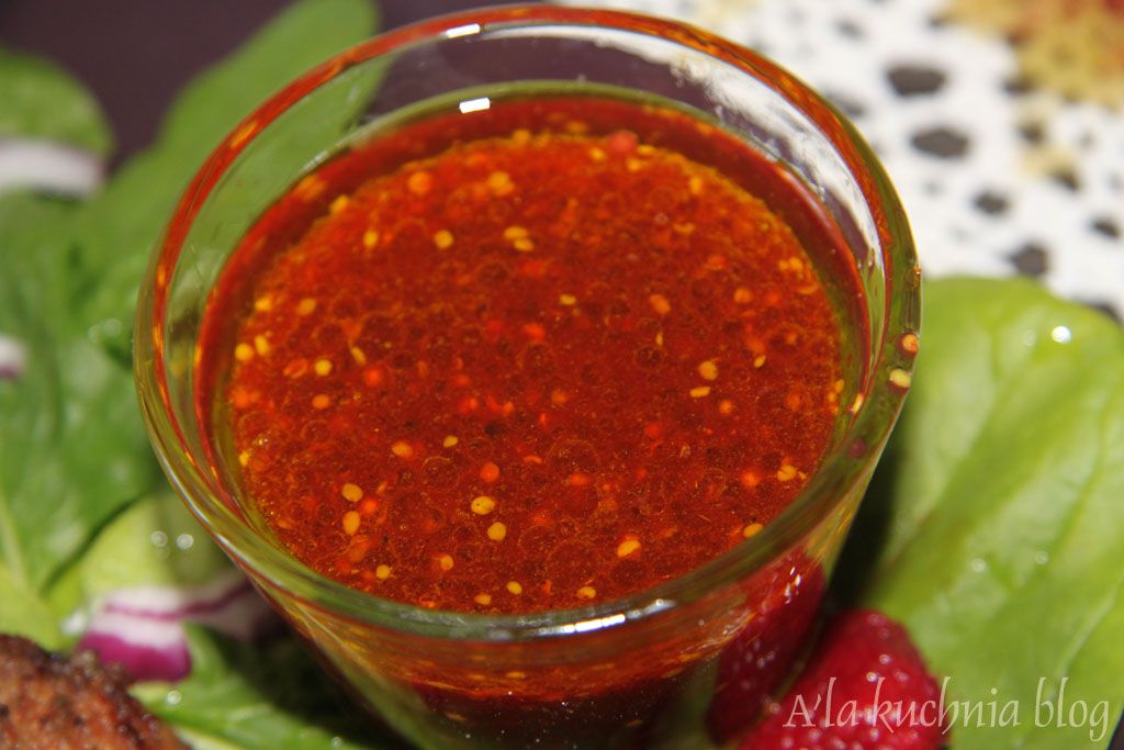 Wątróbkę oczyszczamy z błonek, posypujemy tymiankiem i odstawiamy na 10-15 min. Przygotowujemy sos: ocet mieszamy z musztardą, syropem malinowym, zmiksowanymi 10 dag malin (mogą być mrożone), doprawiamy do smaku, solą, pieprzem i cukrem, na koniec dodając oliwę z oliwek.
