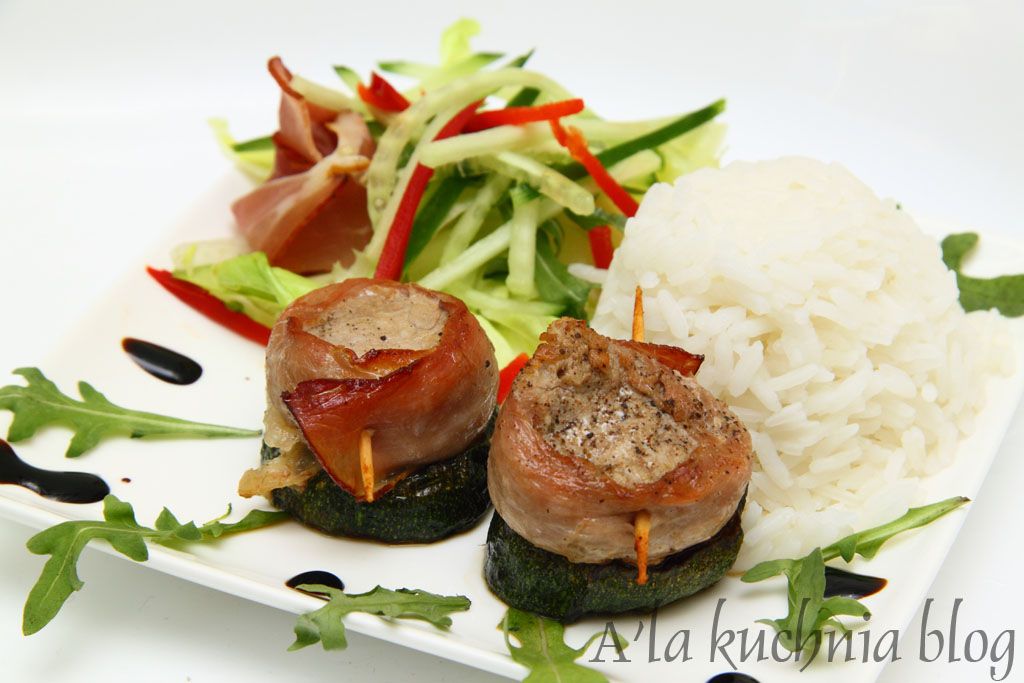 Każdy kawałek polędwiczki owijamy plastrem boczku i spinamy wykałaczką. Posypujemy odrobiną soli i pieprzu i układamy na kawałku cukinii.