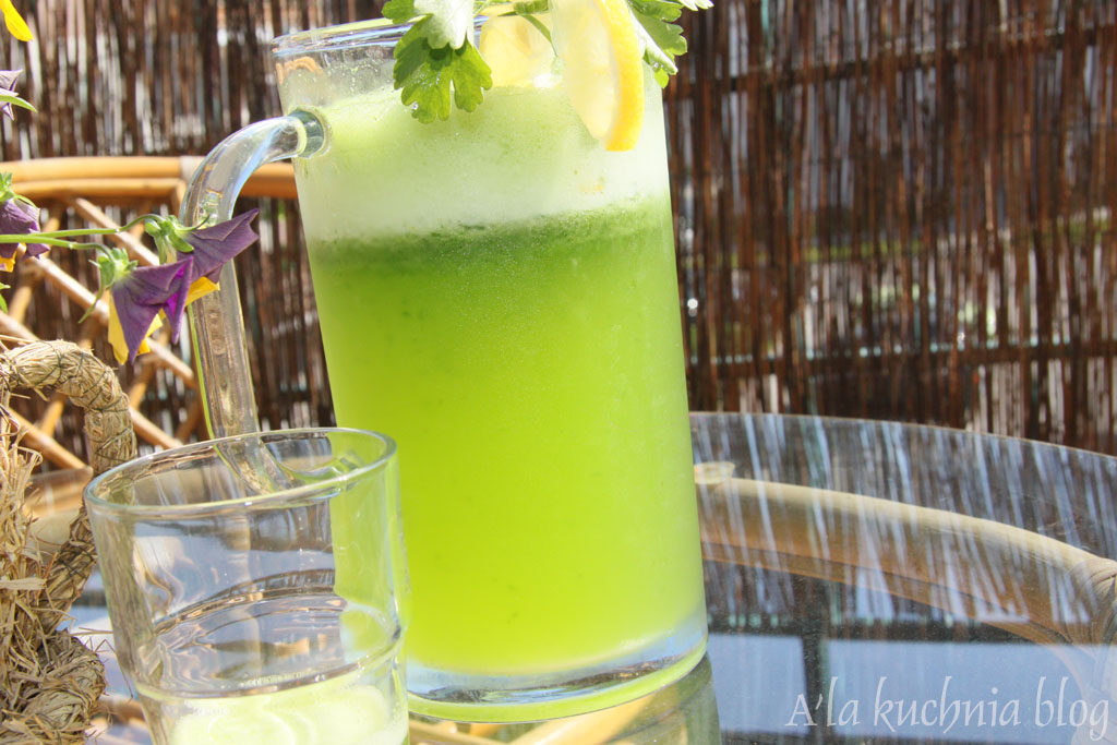 Natkę dokładnie płuczemy w wodzie i wrzucamy do blendera / termomixu wraz z łodyżkami, ale bez korzonków. Dorzucamy ½ obranej ze skórki cytryny (w kawałku), pokruszony lód i cukier- miksujemy na gładko, potem dolewamy zimną wodę (przegotowaną, źródlaną, mineralna- wg uznania). Mieszamy. Serwujemy mocno schłodzone. Smacznego.