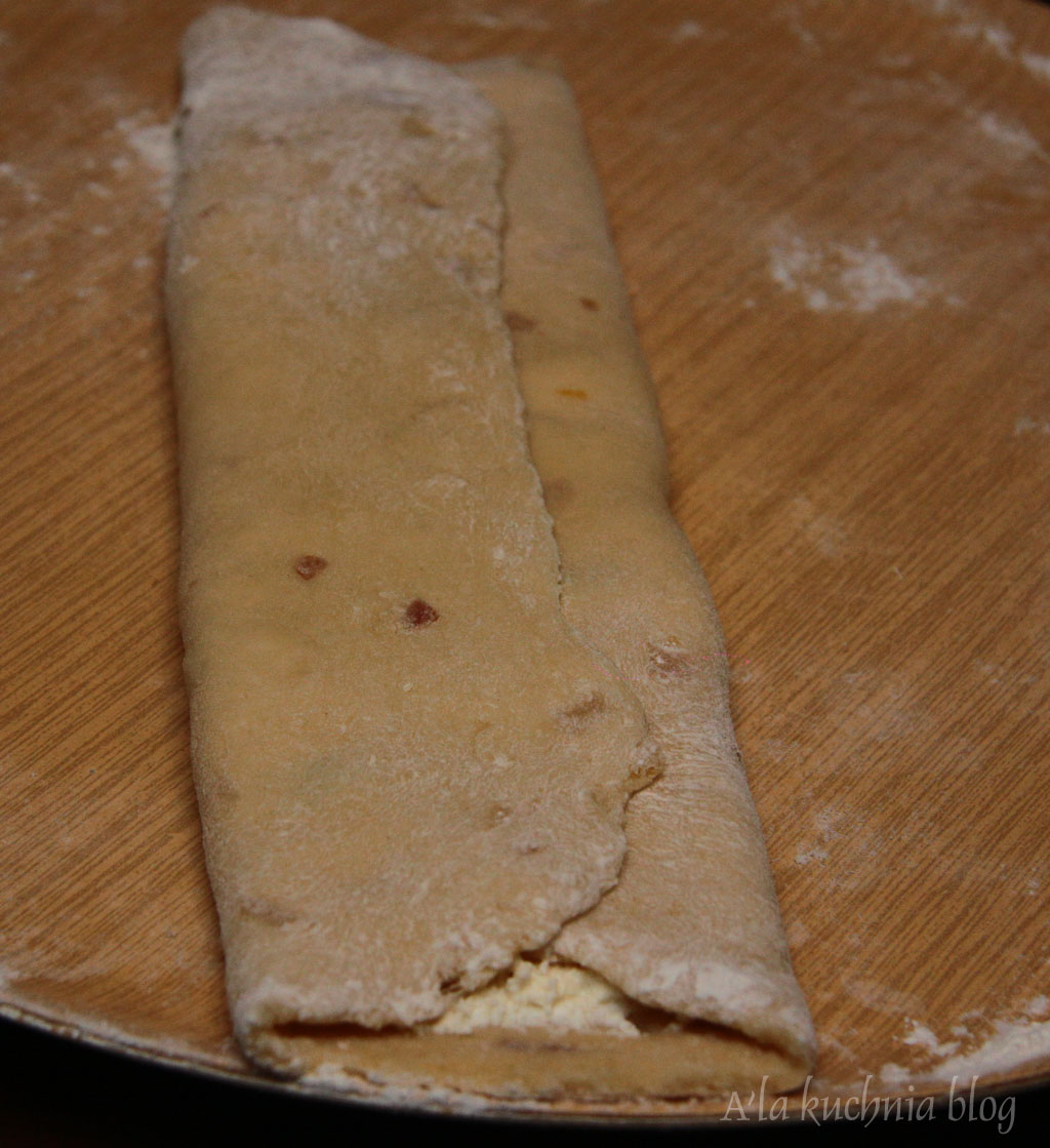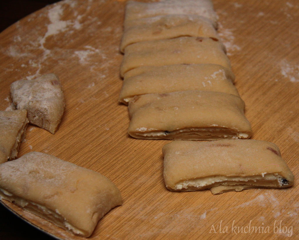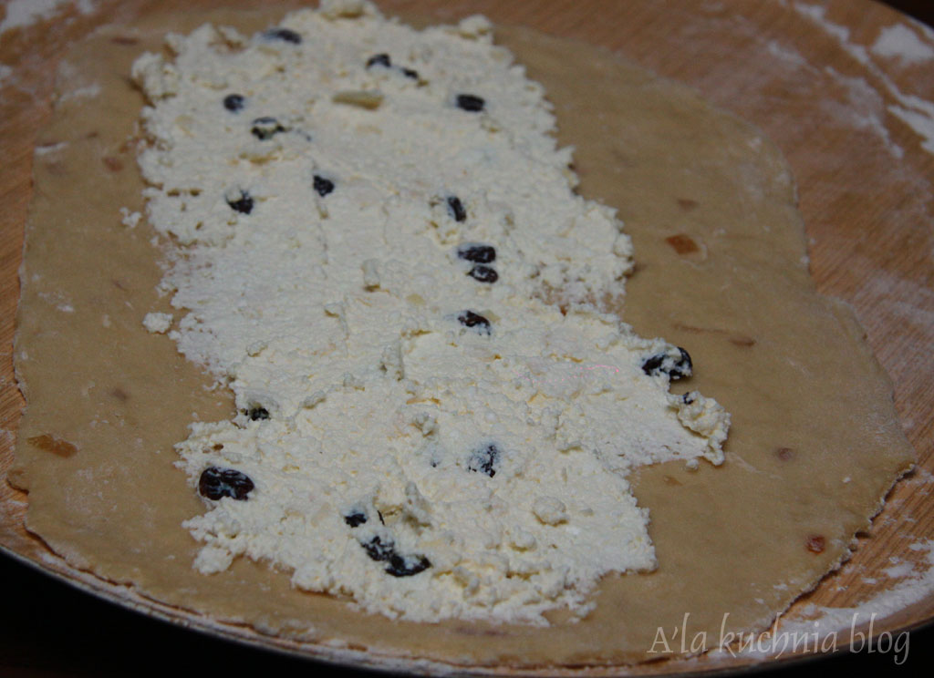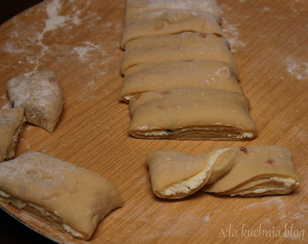 Ciasto lekko odgazować, naciskając delikatnie płasko dłonią, podzielić na 2 części. Każdą rozwałkowujemy na prostokąt i smarujemy połową sera. Składamy na zakładkę do środka - na 2. Następnie kroimy na prostokąty o szerokości ok. 5 cm. Każdy prostokąt następnie skręcamy tak, by powstała „muszka” ( jak w męskim stroju). Odstawiamy na kolejne 15 min do wyrośnięcia.