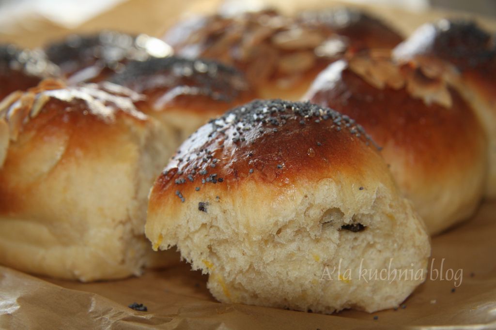 Wierzch bułeczek przed pieczeniem smarujemy roztrzepanym z jedną łyżeczką wody białkiem i posypujemy płatkami migdałowymi lub makiem (obie wersje są przepyszne).