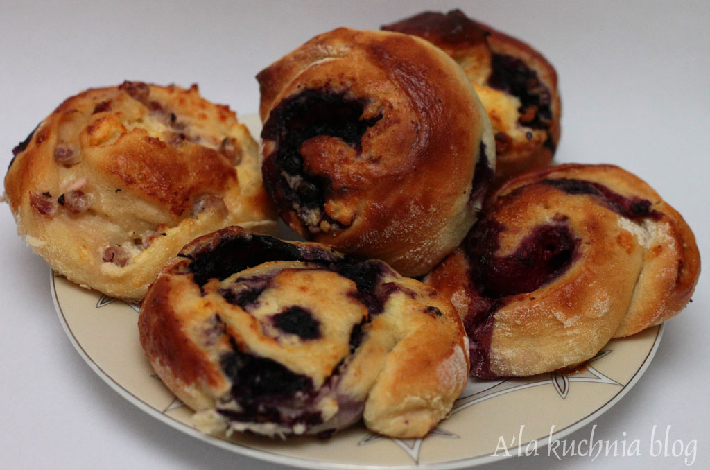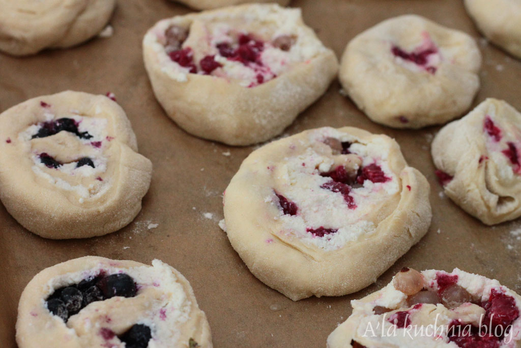 Ciasto lekko odgazować, naciskając delikatnie, płasko dłonią. Dzielimy na kawałki - ja podzieliłam na 3 części. Podsypując mąką każdą część delikatnie wyrobić raz jeszcze i rozwałkować na prostokąt, pamiętając, że ciasto nie może być zbyt cienkie. Placek smarujemy twarogiem wymieszanym z cukrem i jajkiem, posypujemy owocami i zwijamy jak roladę. Kroimy na plastry o szerokości ok. 2 cm i układamy przekrojoną stroną do dołu, na blasze wyłożonej papierem do wypieków lekko rozpłaszczając każdy kawałek. Odstawiamy w ciepłe miejsce do wyrośnięcia na około godzinę. Pieczemy w 190°C przez 20-30 minut.