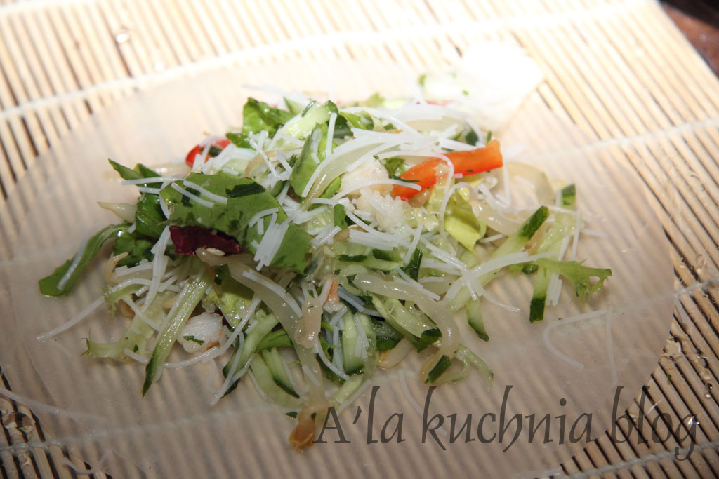 Dwa arkusze papieru ryżowego zamaczamy w zimnej wodzie na ok 30-40 sekund. Wyjmujemy i na środek kładziemy sałatkę krewetkowo – sałatową. Zwijamy jak gołąbki.