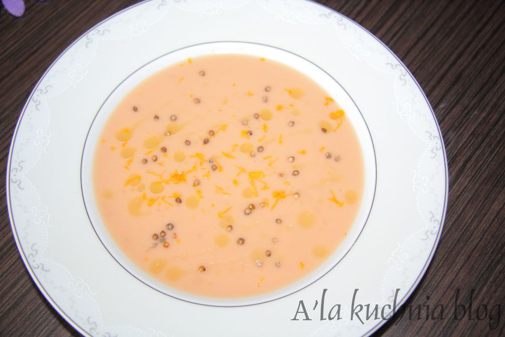 Zupę przelewamy do talerzy i dekorujemy skórką otartą z dobrze wyszorowanej i sparzonej pomarańczy. posypujemy nasionami kolendry, a na koniec skrapiamy oliwą z oliwek. Gotowe.