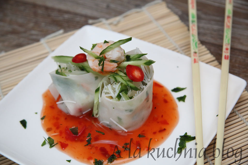 Przystawka + danie główne. Dziś rolki/roladki z papieru ryżowego z sałatką krewetkową. Za kilka dni zapraszam po przepis na kurczaka w zielonym curry coś a’la Tom Kha Kai. Smacznego!