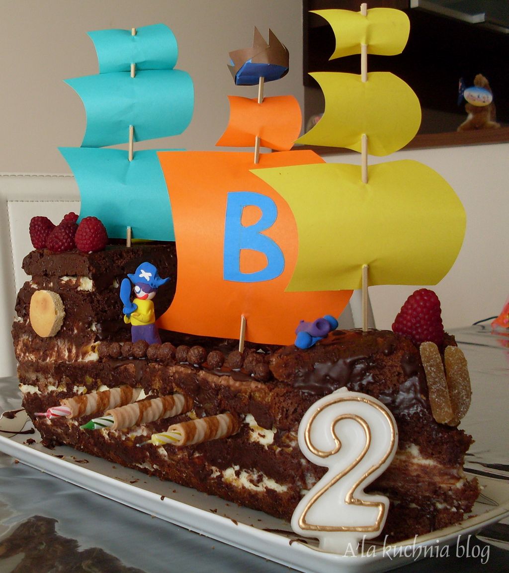 Nie ma to jak zachwycony wzrok Dziecka, kiedy widzi swój tort urodzinowy. Ciasto dla Dzieci moim zdaniem powinno być lekkie i niezbyt słodkie, za to może przybierać dowolne kształty. Na 2 urodzinki Synka powstał czekoladowy tort biszkoptowy z bitą śmietaną i brzoskwiniami w kształcie statku pirackiego.