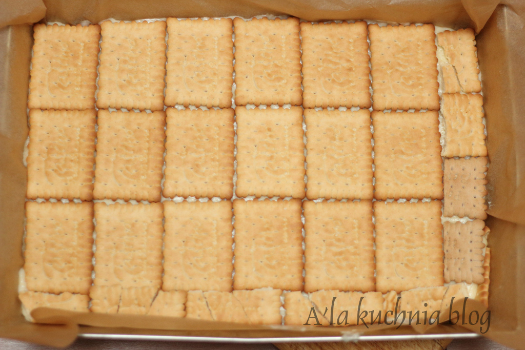 Dużą blaszkę wykładamy papierem do pieczenia, a następnie jej dno przykrywamy herbatnikami. Wylewamy na herbatniki gorącą masę budyniową i układamy na wierzchu ponownie herbatniki. Odstawiamy do ostudzenia.