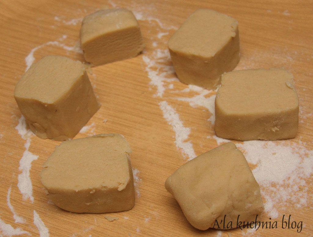 Kostkę kroimy na małe prostokąty. Układamy je na blasze wyłożonej papierem do pieczenia i pieczemy 10-12 min w 170 st. C. (Uwaga, żeby nie przypalić!)