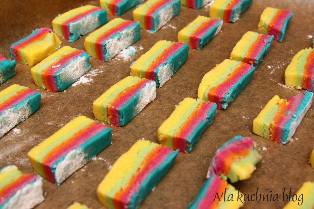 Gotowe ciasto kroimy na 6 równych części. Do każdej dodajemy inny barwnik i zagniatamy osobno. Każdy kolor rozwałkowujemy na prostokąt a następnie układamy jeden na drugim ( w wybranej indywidualnie kombinacji). Wkładamy do lodówki na kilkanaście minut do schłodzenia.