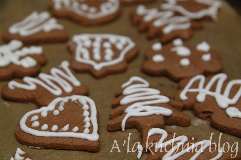 Białko miksujemy dodając partiami cukier puder tak długo, aż otrzymamy błyszczącą i bardzo gęstą masę. Przekładamy ją do woreczka lub rękawa cukierniczego i ozdabiamy pierniczki. Zostawiamy do zastygnięcia lukru i dopiero wtedy przekładamy do pojemniczków – u nas zniknęły w ciągu 2 dni.