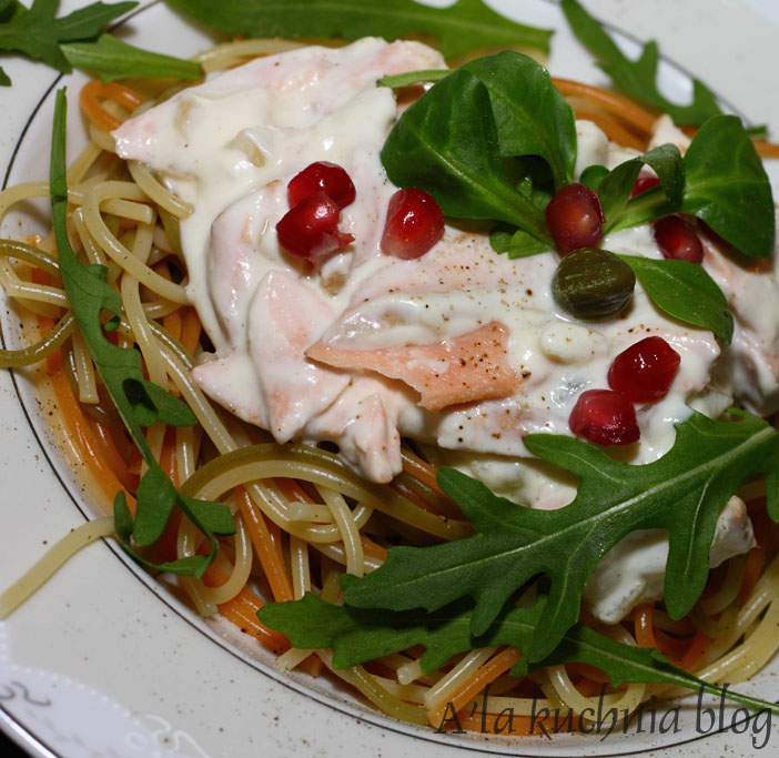 Ryby są ważne w naszej diecie, ale ileż można jeść paluszki rybne, albo rybę smażoną. Przecież jest tyle różnych sposobów serwowania ryby. Moja Rodzinka uwielbia dania z makaronem, więc dziś w roli głównej było spaghetti z grillowanym łososiem z dodatkiem pestek granatu, kaparów z zalewy oraz rukoli w przepysznym sosie śmietanowym.... wiem trochę kaloryczne (bo śmietana) ale smak rewelacyjny. Nam smakowało!