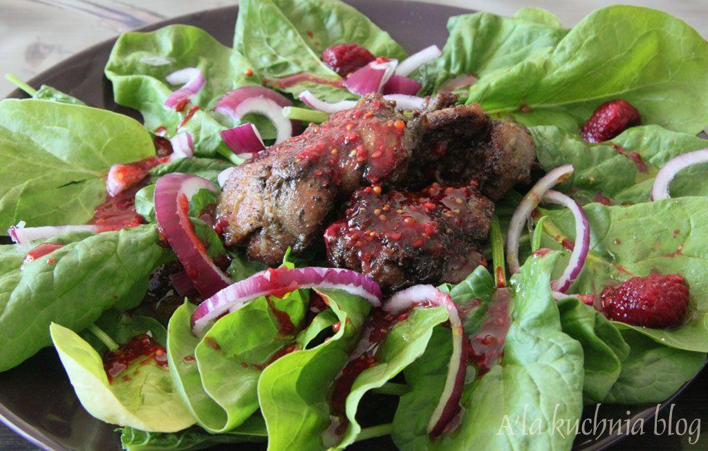 Świeżutki szpinak jedzony jak sałata? Dodatek mięsny w postaci wątróbki, a do tego sos malinowy.... danie gotowe... i ten cudowny smak.... polecam!