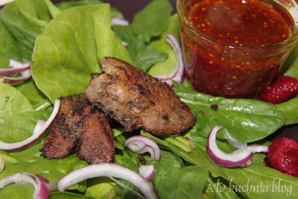 Świeżutki szpinak jedzony jak sałata? Dodatek mięsny w postaci wątróbki, a do tego sos malinowy.... danie gotowe... i ten cudowny smak.... polecam!