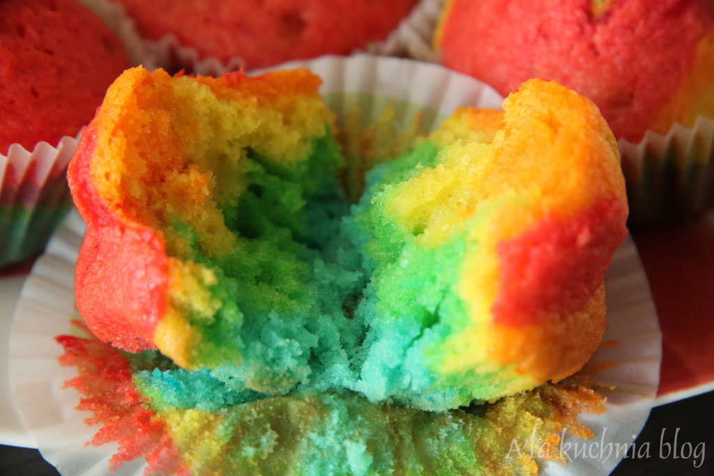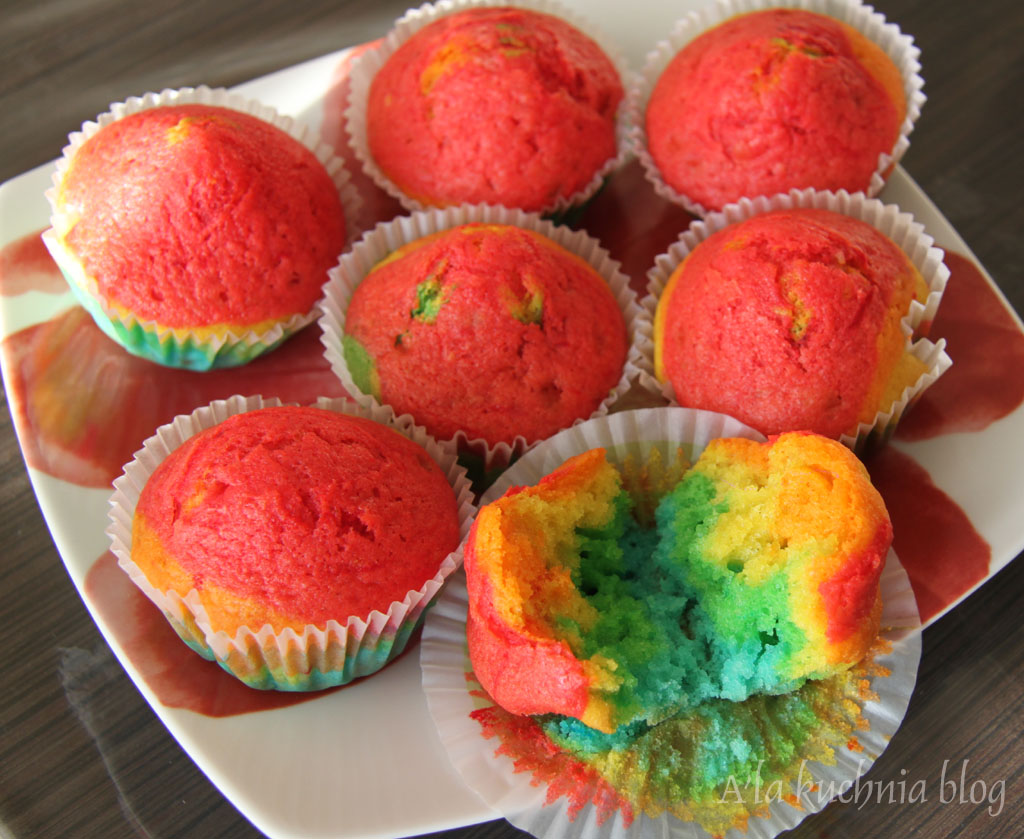 Wymieszać ze sobą osobno składniki suche i mokre, poczym je połączyć. Podzielić masę na 5 części, przekładając każdą do osobnej miseczki. Do każdej miseczki dodajemy odrobinę barwnika- ja miałam barwniki w proszku, ale mogą być również w płynie – mieszamy do otrzymania jednolicie zabarwionej masy. Papilotki (papierowe osłonki do muffinek) wkładamy w foremki do babeczek i kolejno wylewamy po 1 łyżce masy w kolorach: niebieski, zielonym żółtym, pomarańczowym i czerwonym do każdej. Piekarnik nagrzewamy do 180 st C i pieczemy ok. 15-20 min.