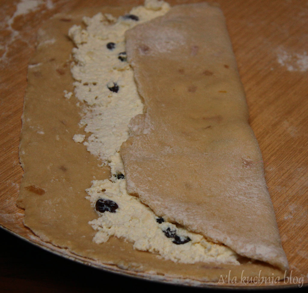 Twaróg zmielić lub rozdrobnić, dodać cukier waniliowy, 1 jajko, rodzynki i dokładnie wymieszać.