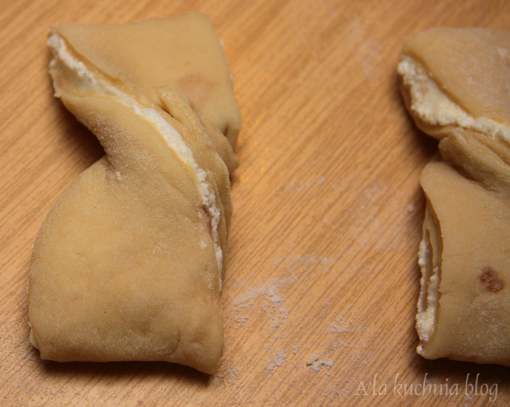 Ciasto lekko odgazować, naciskając delikatnie płasko dłonią, podzielić na 2 części. Każdą rozwałkowujemy na prostokąt i smarujemy połową sera. Składamy na zakładkę do środka - na 2. Następnie kroimy na prostokąty o szerokości ok. 5 cm. Każdy prostokąt następnie skręcamy tak, by powstała „muszka” ( jak w męskim stroju). Odstawiamy na kolejne 15 min do wyrośnięcia.