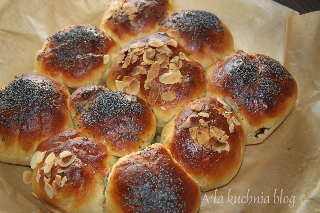 Wierzch bułeczek przed pieczeniem smarujemy roztrzepanym z jedną łyżeczką wody białkiem i posypujemy płatkami migdałowymi lub makiem (obie wersje są przepyszne).