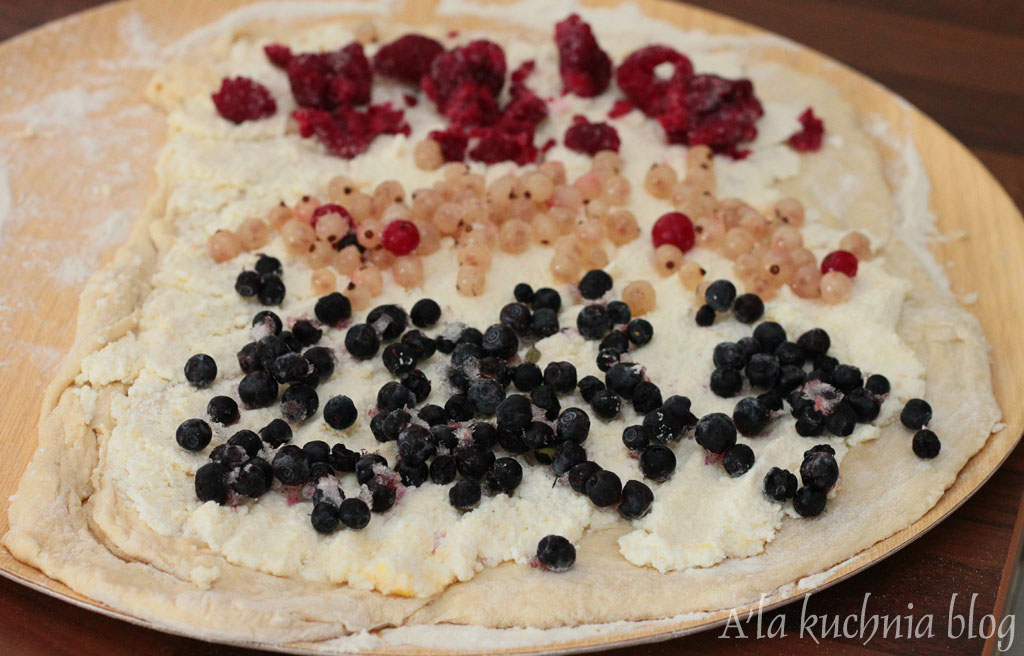 Ciasto lekko odgazować, naciskając delikatnie, płasko dłonią. Dzielimy na kawałki - ja podzieliłam na 3 części. Podsypując mąką każdą część delikatnie wyrobić raz jeszcze i rozwałkować na prostokąt, pamiętając, że ciasto nie może być zbyt cienkie. Placek smarujemy twarogiem wymieszanym z cukrem i jajkiem, posypujemy owocami i zwijamy jak roladę. Kroimy na plastry o szerokości ok. 2 cm i układamy przekrojoną stroną do dołu, na blasze wyłożonej papierem do wypieków lekko rozpłaszczając każdy kawałek. Odstawiamy w ciepłe miejsce do wyrośnięcia na około godzinę. Pieczemy w 190°C przez 20-30 minut.
