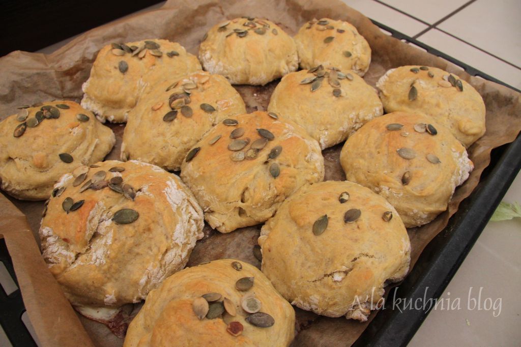 Czasami nachodzi mnie ochota na pieczywo domowej roboty, a ponieważ uwielbiam wszelkiego rodzaju pestki i kiełki, na naszym stole zawitały bułki dyniowe...