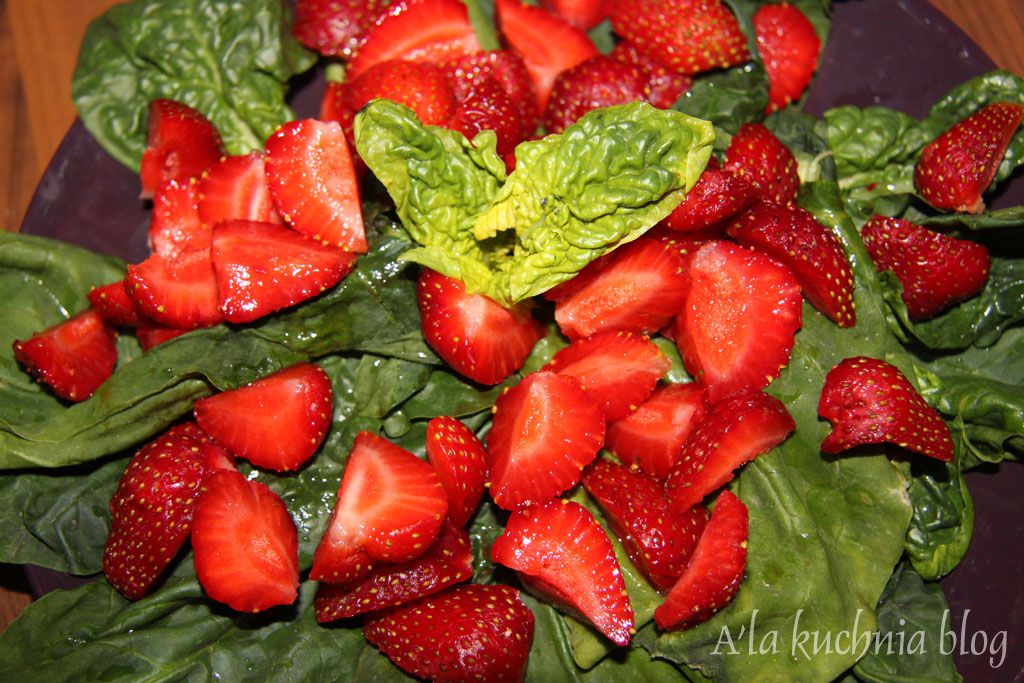 Wreszcie pojawił się mój kochany szpinak. Przechodząc koło warzywniaka nie mogłam się oprzeć i kupiłam kilka pęczków tego „zielska”. Makaron ze szpinakiem był na obiadek a na kolację, żeby niej kalorii było (bo znowu jem bardziej dietetycznie) najprostsza sałatka z możliwych młody szpinak, truskawki, sos balsamico i gotowe!